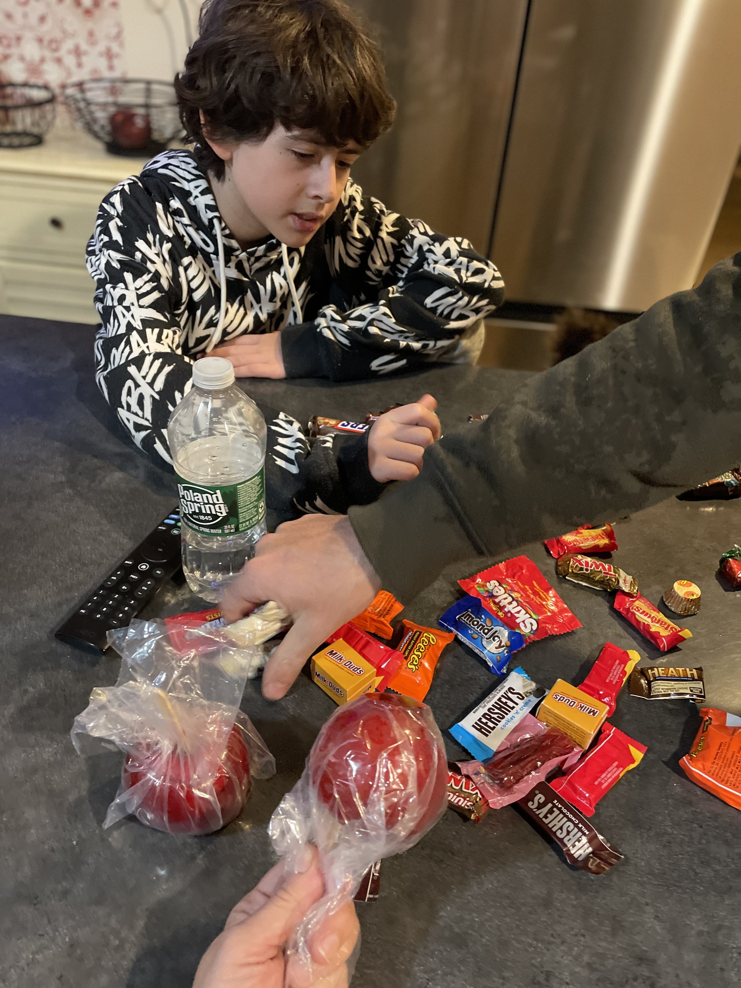 Esse Halloween eu não fui. Não busquei. Não sai de perto da lareira. E, por estar cortando açúcar na minha alimentação, nem mencionei a maçã do amor das senhorinhas pro meu filho. E aí, enquanto me distraía entre escolher uma fatia de queijo ou pepperonni, o menino de máscara e capecete se aproxima e tira da sacola um saquinho de plástico amassado, grudado àquela fruta perfeitamente encrostada em uma camada de açúcar com corante vermelho _ “Pra você.”